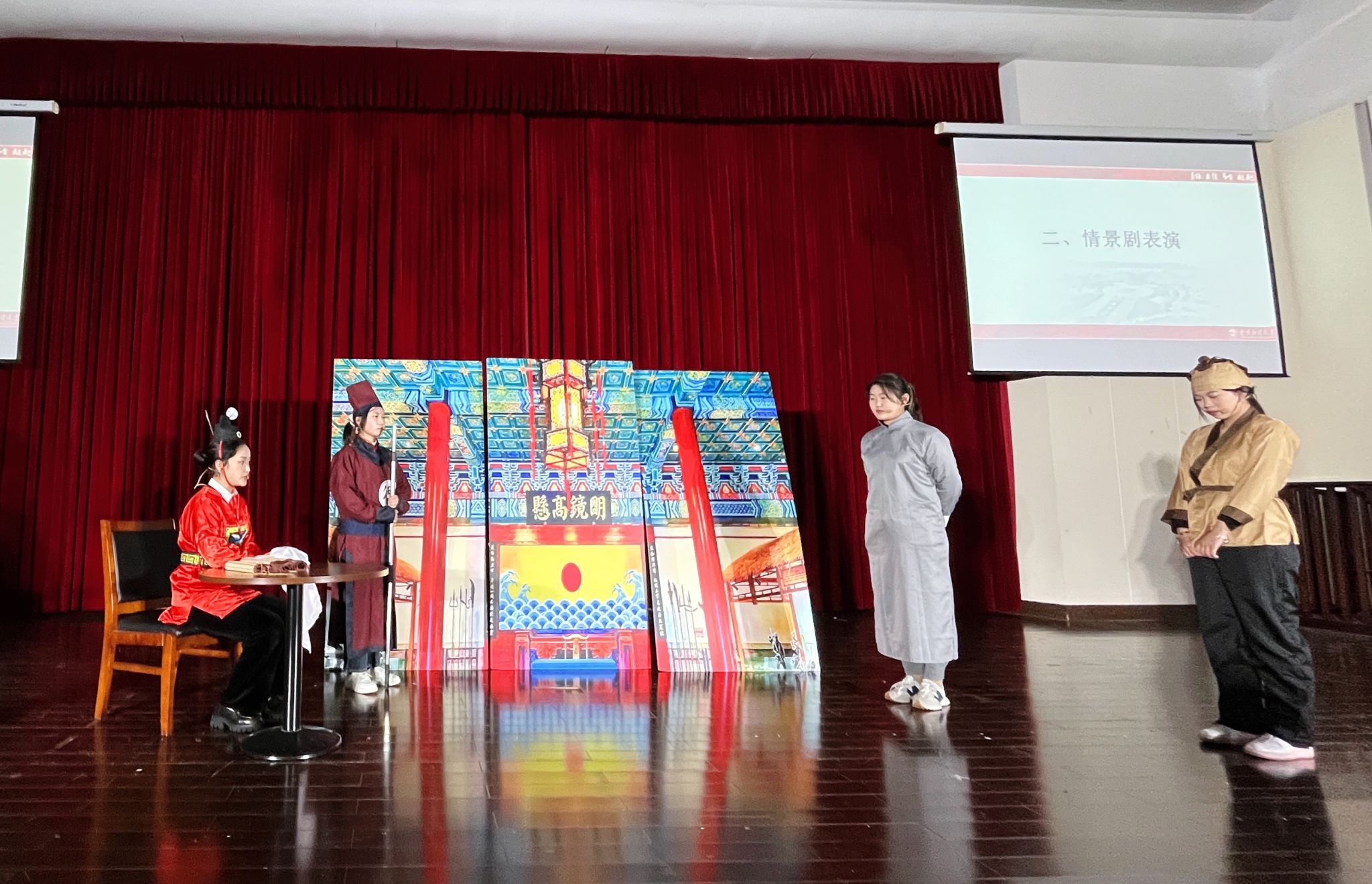 随后,在领读员的带领下,现场全体人员进行了《宪法》诵读。开幕式上,同学们上演了精彩纷呈的节目。原创历史情景剧《法脉千年》,从新时代青年的视角演绎当代中国特色社会主义法治体系的新辉煌。生动而不失庄重,风趣而不乏敬畏。