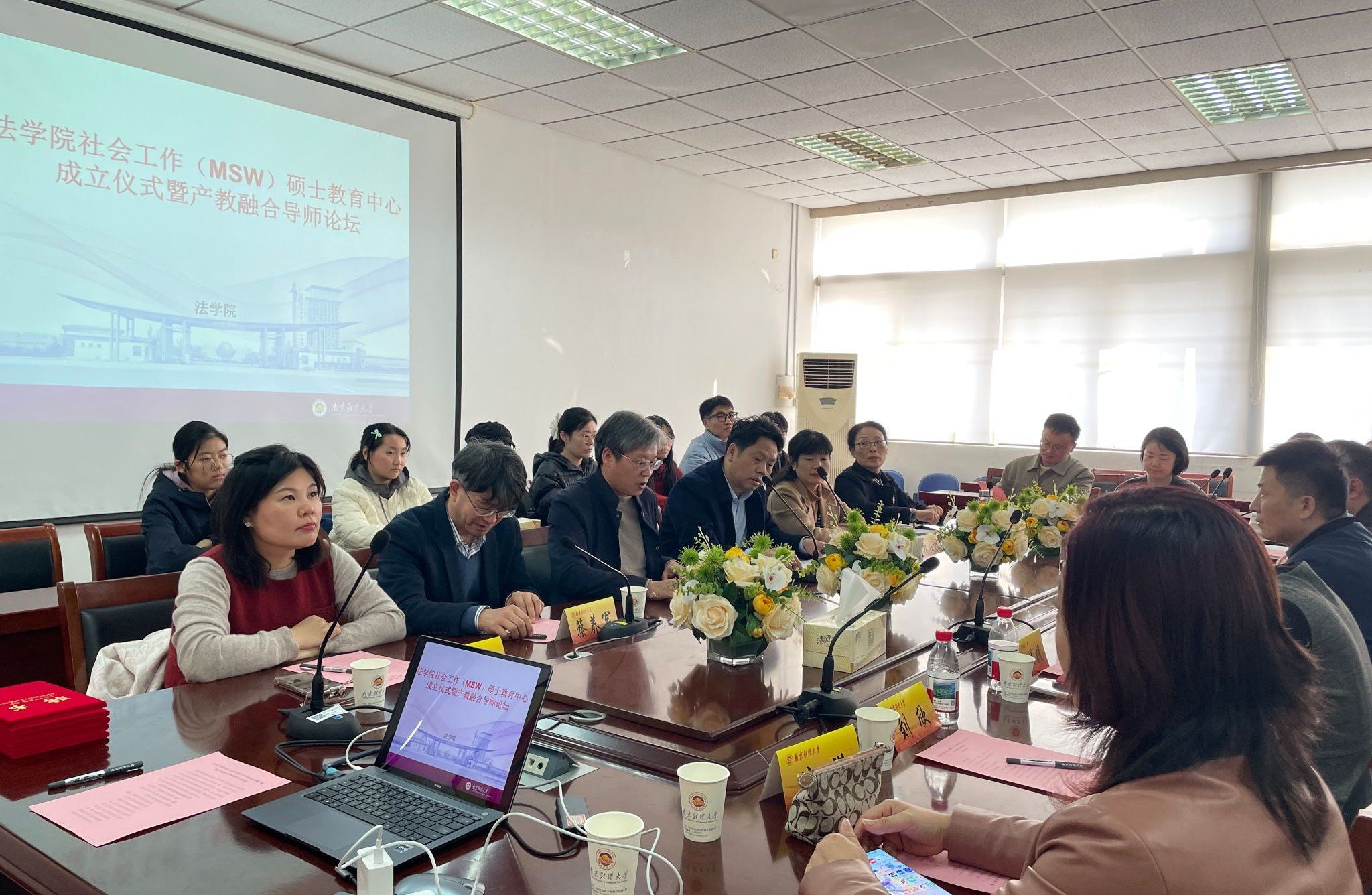 12月10日下午,黑料网 社会工作硕士(MSW)教育中心成立仪式暨产教融合导师论坛在仙林校区德正楼404会议室隆重举行。学院党委书记黄建国、院长胡宜奎、副院长蔡养军、副院长陈红梅等学院领导出席会议。南京市栖霞区启蒙社区发展中心理事长岳耀蒙、南京同心未成年人保护和服务中心总干事高娟娟、南京市救助站高级社会工作师刘欣、南京市益民社会服务中心理事长姜媛媛以及南京市溧水区英博社会工作服务中心理事长王合涛等行业专家受邀出席。黑料网 社会工作系全体教师、研究生及部分本科生代表参加了本次活动。成立仪式由黄建国书记主持。