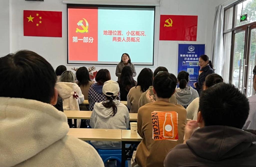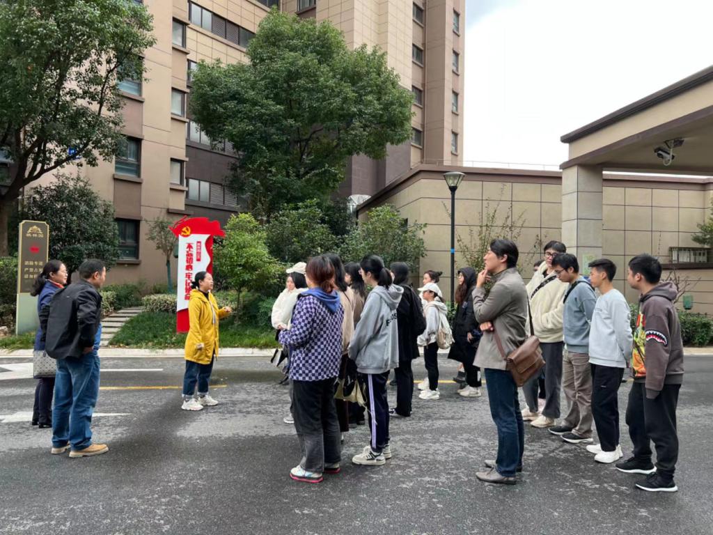 向上社区梁晴书记对同学们的到来表示热情欢迎,并为同学们详细介绍了社区的地理位置、小区概况、社区两委人员概况、开展的特色工作、主题教育开展情况以及所获荣誉。向上社区地处南京东郊,北起土城头路,南与江宁区交界,东邻本街道蛇盘社区,西至启迪大街。社区目前辖区为花岗鸿福城,是南京市市级保障性住房小区。两委成员共6人,其中支委班子成员3人。开展的特色工作有:党建+“点亮红色枫林”项目、架空层“儿童友好空间”、翠城园群众文化广场等。荣获栖霞区掌上云社区十佳满意度社区、江苏省级垃圾分类示范小区等称号。