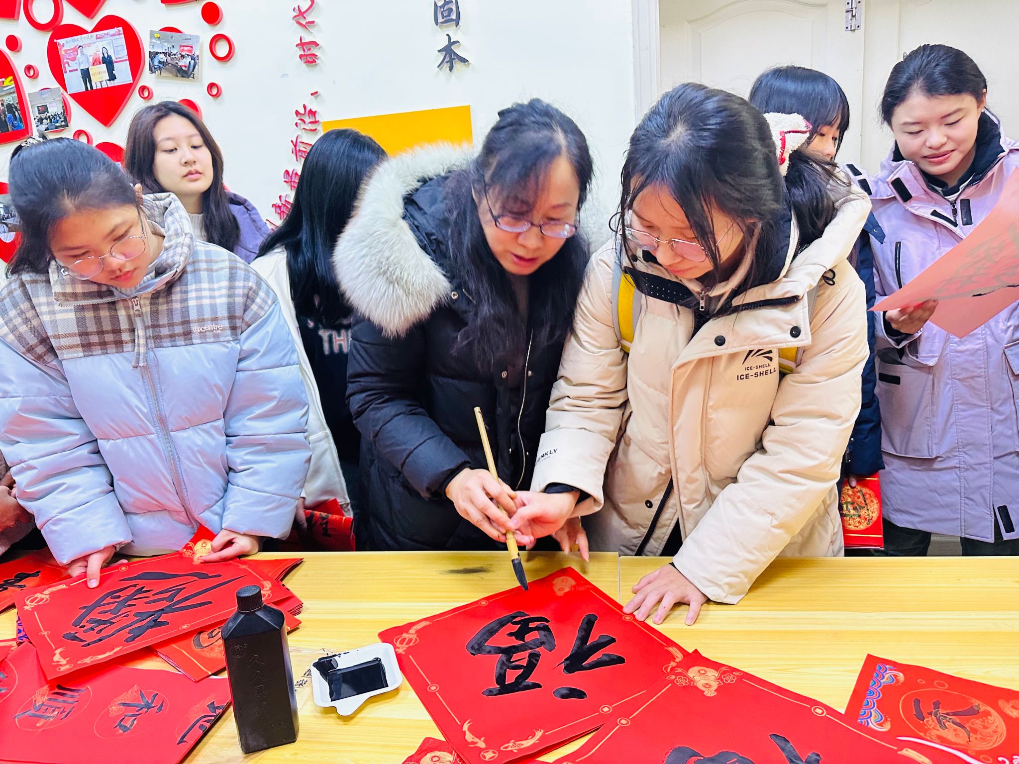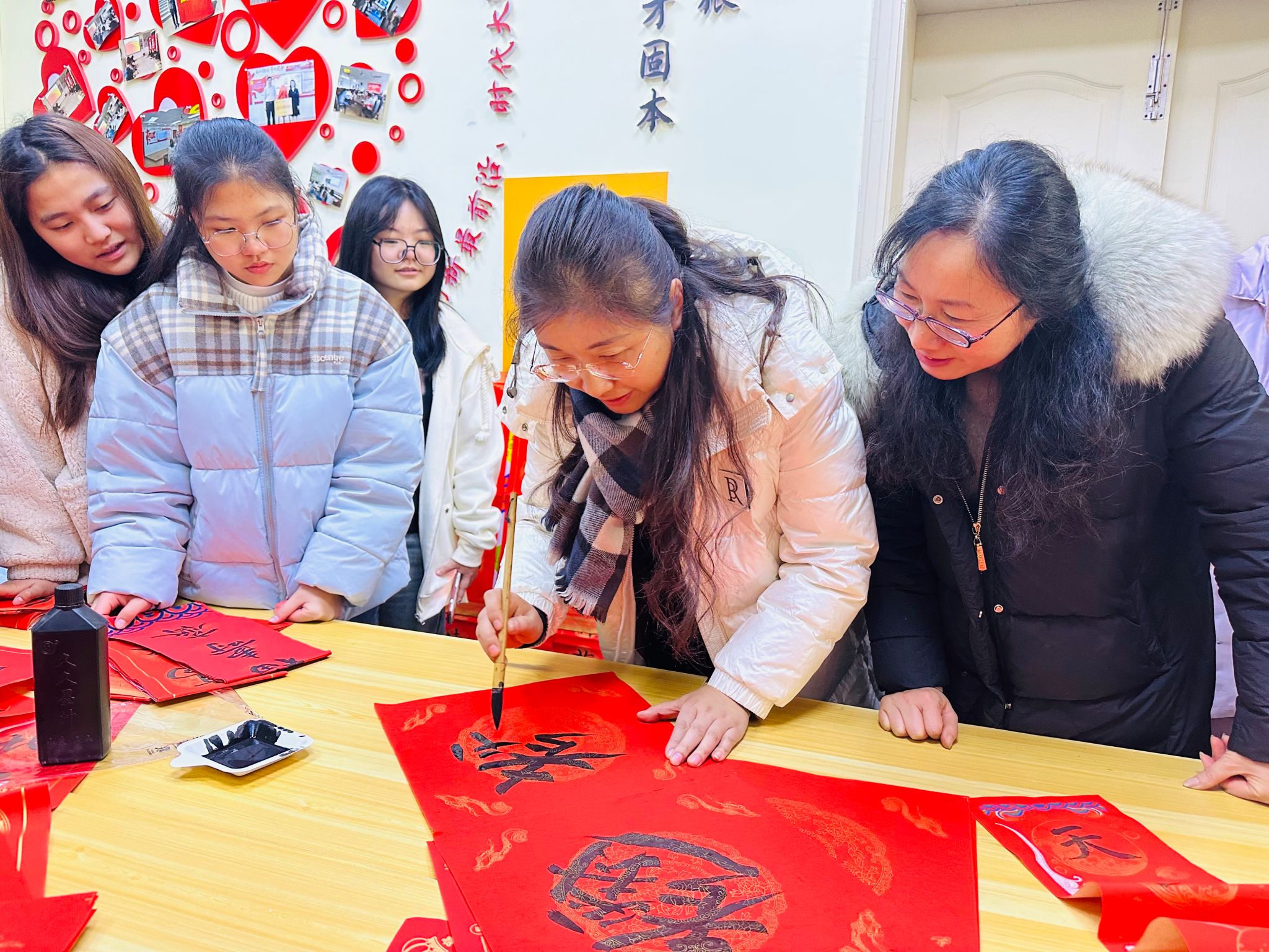 活动中,老师们关心地询问同学们期末学习和生活情况,并建议同学们利用好寒假时间,通过社会实践提高自己的综合能力。随着活动的开展,党员教师们开始挥毫泼墨,一幅幅寓意吉祥、充满正能量的春联跃然纸上。龚月红老师转动笔锋,写出了字体灵动、苍劲有力的新春对联和“福”字,将心底的美好祝愿化作一张张寓意平安和谐、吉祥如意的书法作品,书写出对同学们的美好祝愿。同学们也踊跃参与,在老师们的指导下写出了有模有样的作品。“迎新春年年如意,接鸿福步步高登”“学海无涯勤者进,书山有路志者攀”,一幅幅对联表达了对新年的美好祝愿和对同学们的殷切期望。同学们挑选着自己心仪的春联,脸上洋溢着笑容。由于临近期末考试,同学们纷纷向老师们“求”起了“考的都会”“逢考必过”等字样,现场传来阵阵欢乐的笑声。