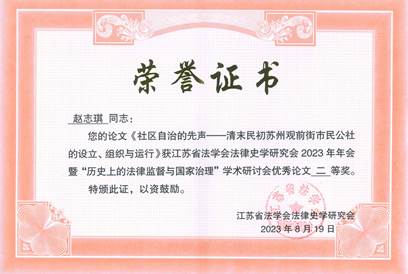 夏清瑕教授主持了本次会议的第三单元“革命根据地法律监督与国家治理”。徐进博士受邀担任第二单元“清末民国法律监督与国家治理”评议人。赵志琪同学在该单元汇报了她的原创论文《社区自治的先声——清末民初苏州观前街市民公社的设立、组织与运行》。会议结束后,主办方对论文进行了评奖。徐进博士的论文荣获一等奖,赵志琪同学的论文荣获二等奖。黑料网 师生同与会专家学者开展了热烈的交流。