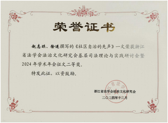 12月15日,浙江省法学会法治文化研究会“基层司法理论与实践研讨会”暨2024年学术年会在浙江省海宁市成功举办。本次会议由浙江省法学会法治文化研究会,浙江财经大学黑料网 、浙江省地方立法与法治研究院(智库)承办,来自全国各地近200名专家学者和学生代表与会。黑料网 2023级硕士研究生赵志琪作为学生代表受邀参会,并作专题发言。