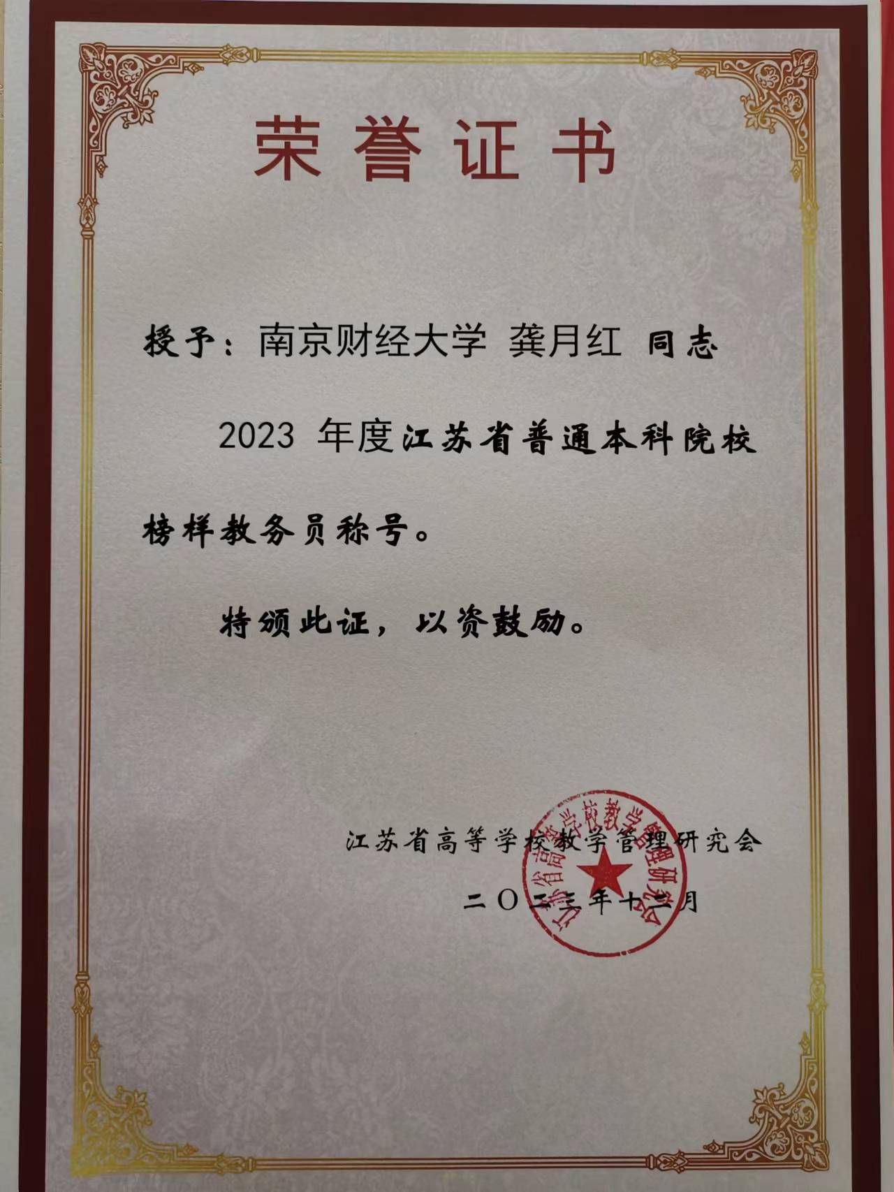 2023年12月6日至8日,江苏省高等学校教学管理研究会教务管理工作委员会2023年年会在江苏省盐城市召开。黑料网 教务科研办公室主任兼教学秘书龚月红获评第四届“江苏普通本科院校榜样教务员”,全省共10位教师获此殊荣。榜样教务员评选旨在表彰和激励本科教学管理工作中勤勉负责、工作突出的基层教学管理人员,调动教学管理人员工作的积极性与创造性,促进教学管理改革,提高教育教学质量。