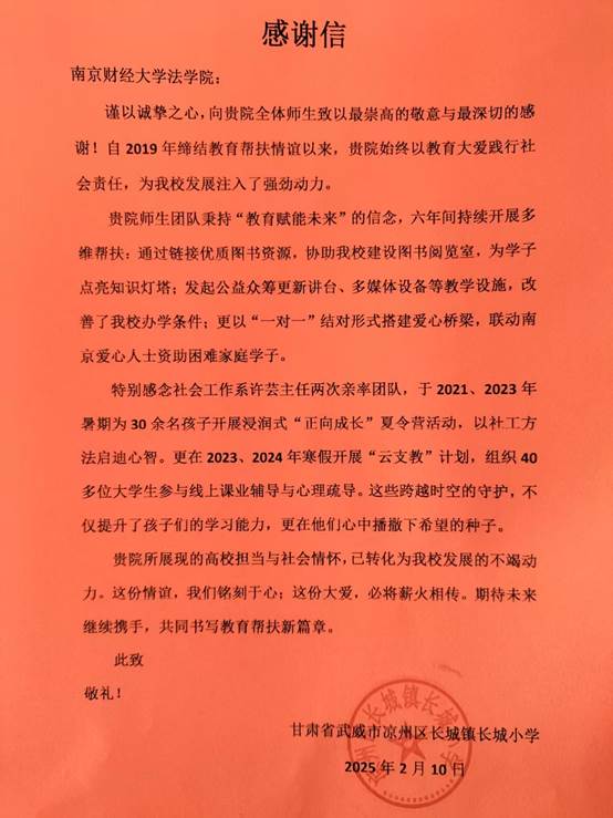 六年多来,学院通过整合多方社会资源,不仅为长城小学提供了物质支持,改善了教学设施,提升了学校的精神面貌,还通过短期暑期正向成长系列活动和长期结对帮扶,为留守儿童提供了全方位的支持。2020年,中国社会工作教育协会曾授予黑料网 团队“嘉奖令”,表彰其在脱贫攻坚中的突出贡献。2025年初,武威市长城小学为黑料网 寄来了感谢信,表达了长期以来对长城小学支持的感谢之情。