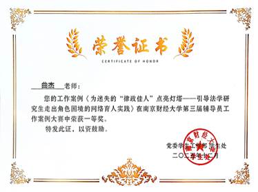 曲杰的工作案例《为迷失的“律政佳人”点亮灯塔——引导法学研究生走出角色困境的网络育人实践》荣获一等奖。该案例立足法学研究生的专业成长与角色认知困境,创新运用网络育人载体,为学生提供精准的心理支持与职业引导,为新时代高校网络思政工作提供了可借鉴的实践样本。