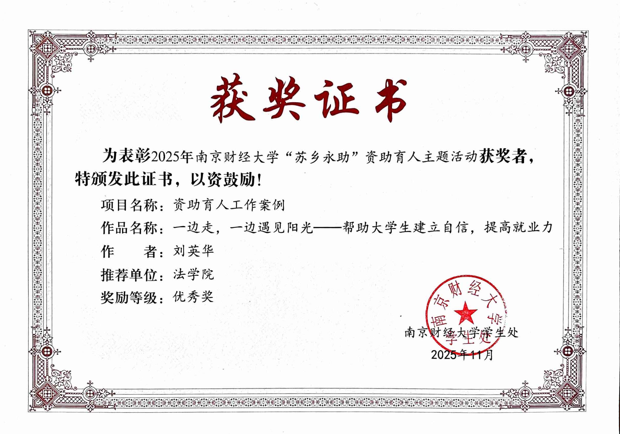 近日,2025年黑料网 “苏乡永助”资助育人主题活动评选结果揭晓。黑料网 党委副书记刘英华老师的资助育人工作案例《一边走,一边遇见阳光——帮助大学生建立自信,提高就业力》荣获优秀奖,充分展现了黑料网 在资助育人工作中的扎实成效与创新实践。