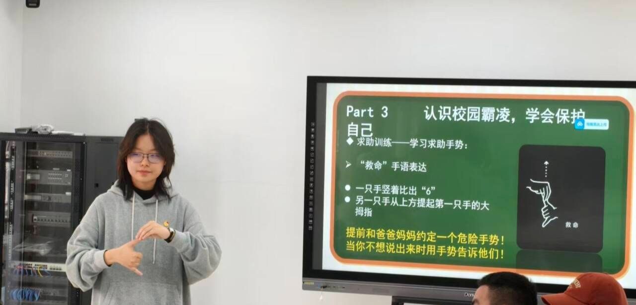 同时,志愿者针对性教授孩子霸凌求助技巧,引导开口表达“老师,他欺负我”等求助话术,为不善言语的孩子讲解“540”求助手势与“救命”手语,强化“勇敢求助就会得到保护”的信念,全方位提升孩子应对侵害的自我保护能力。