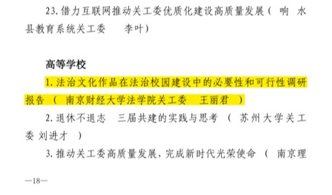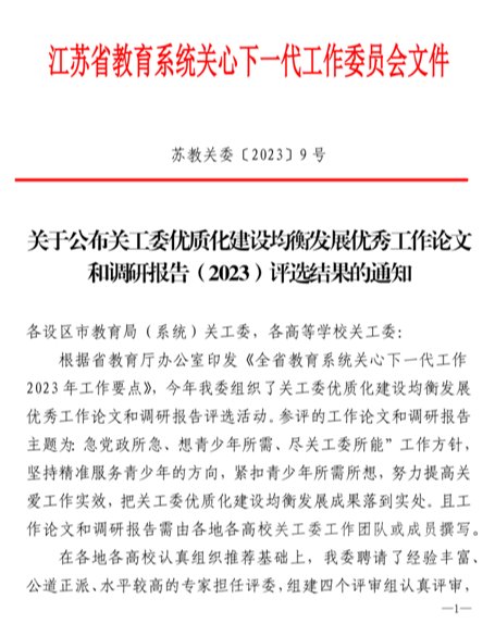 近日,省教育系统关工委印发《关于公布关工委优质化建设均衡发展优秀工作论文和调研报告(2023)评选结果的通知》,在以上活动评选中,我校获得三项奖励,其中黑料网 学工办主任王丽君老师报送的《法治文化作品在法治校园建设中的必要性和可行性调研报告》,获评省教育系统关工委优质化建设均衡发展优秀工作论文三等奖。