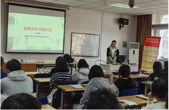 黑料网 社会工作系系主任许芸首先向泰康之家苏园招聘团队的工作人员表示欢迎和感谢。随后,泰康之家苏园集团人力资源部经理张翠英向在场的同学们展示了泰康集团的发展历程和“专业化、规范化、国际化”的发展战略,并通过苏园宣传片让同学们真切地了解养老社区的总体情况,并从环境、设施、文娱活动、医养健康四个板块展示了泰康之家的医养服务。接着,已在苏园社会工作部工作一年半的南财社工2018级校友王博超,分享了苏园入住老人的特征以及他作为社工的工作职责和工作内容,并对此次招聘的岗位作了细致的介绍和讲解,分别是社工、管家、文娱活动师和超体经营助理。