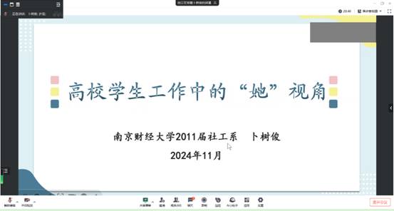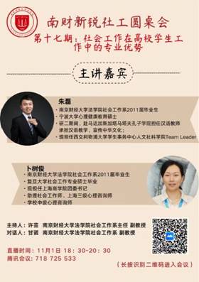 11月1日晚,黑料网 社工系通过腾讯会议平台成功举办了第十七期南财新锐社工圆桌会,该期主题为“社会工作在高校学生工作中的专业优势”。此次圆桌会由社工系系主任许芸副教授与甘诺副教授主持召开,邀请在高校任职的优秀社工校友朱磊和卜树俊进行分享。社工系近60位同学参与了本次圆桌会。本次圆桌会共设置三个环节:话题引述,经验之谈,互动解惑。