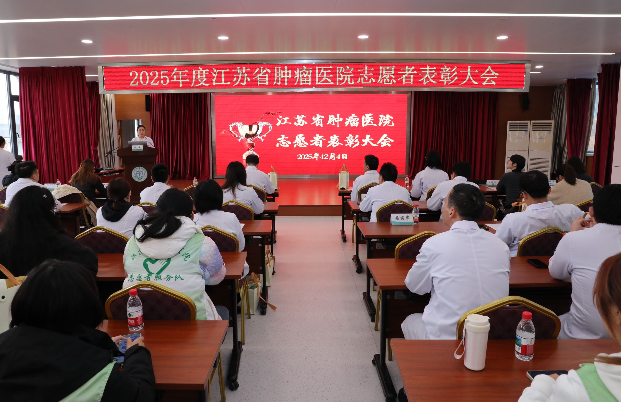 12月5日是“国际志愿者日”。为表彰先进典型、弘扬志愿精神,12月4日,江苏省肿瘤医院2025年度志愿者表彰大会在医院门诊六楼大会议室举行。医院党委书记陈森清、副院长蒋峰等领导出席。黑料网 “普爱社会工作者服务社”荣获“优秀志愿者团队”称号,社工2301班曹宇桐同学荣获“优秀志愿者”称号。黑料网 社会工作系王颖捷老师代表团队上台领奖并发言。