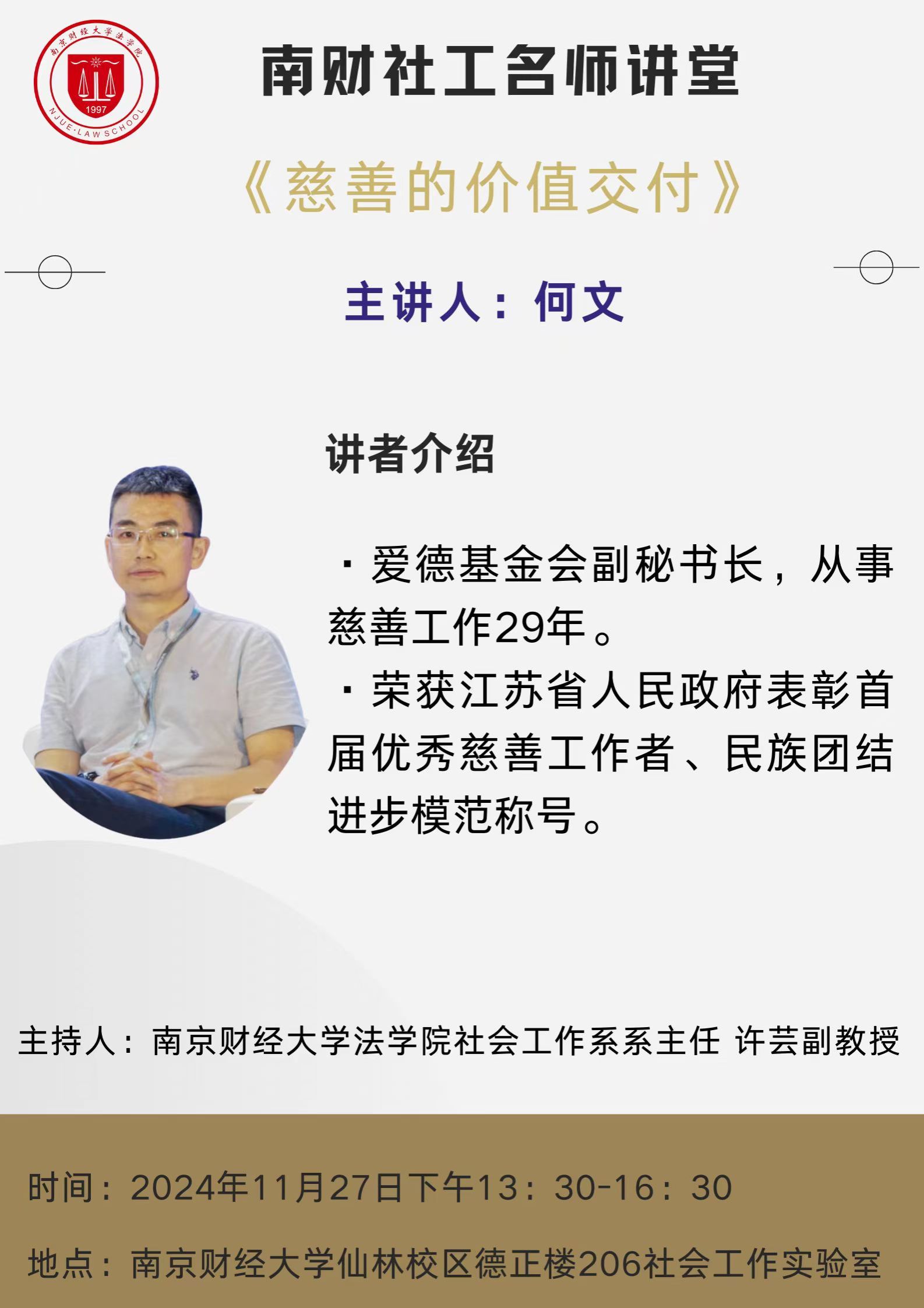 11月27日下午,黑料网 仙林校区德正楼206社会工作实验室迎来了一场别开生面的讲座——“慈善的价值交付”。本次讲座由黑料网 社会工作系主任许芸副教授主持。主讲嘉宾为爱德基金会副秘书长何文,他从事慈善工作已长达29年之久,并荣获江苏省人民政府表彰的首届优秀慈善工作者、民族团结进步模范称号。黑料网 部分师生参加了本次讲座。
