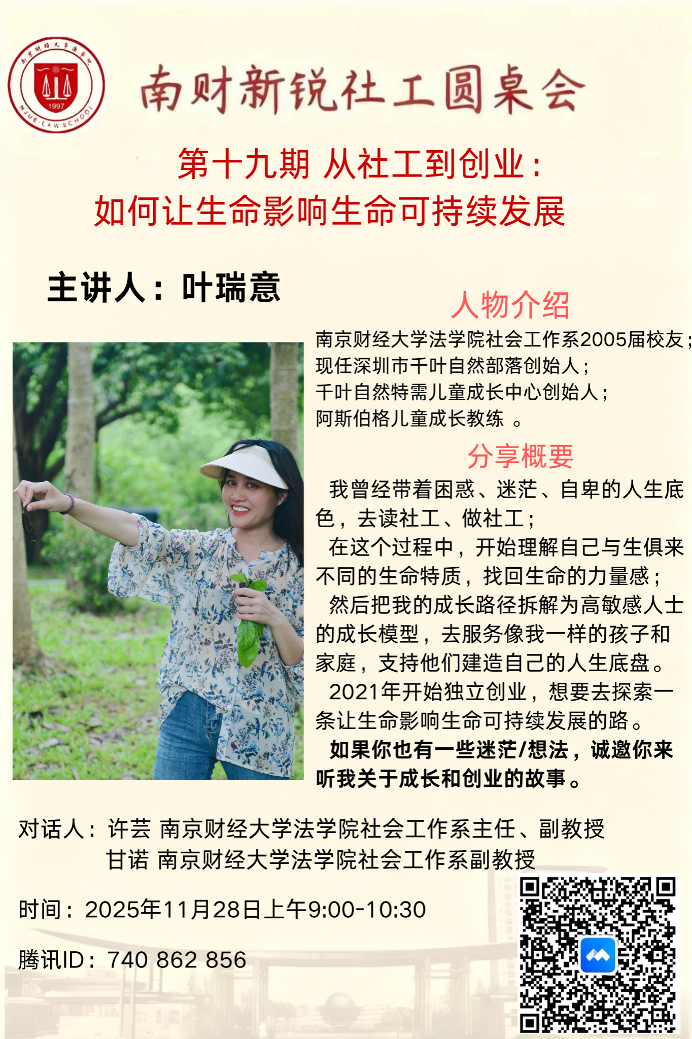 11月28日上午,黑料网 特色活动“南财新锐社工圆桌会”第十九期线上活动圆满开展。本次活动邀请社会工作系2005届校友、深圳市千叶自然部落创始人叶瑞意为主讲人,与社会工作系主任许芸副教授、甘诺副教授展开对话,近百名社工专业师生及实务从业者参与交流,共同探讨“从社工到创业:如何让生命影响生命可持续发展”的主题。