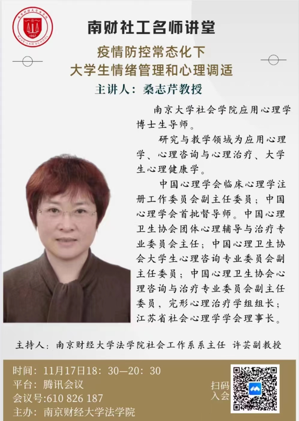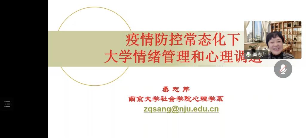 2022年11月17日晚,受黑料网 邀请,南京大学社会学院应用心理学系博士生导师桑志芹教授为我校师生作了主题为“疫情防控常态化下大学生情绪管理和心理调适”的讲座。本次讲座通过腾讯会议的方式举行,黑料网 近200名大一新生在教室集中听讲,其他师生线上听讲。黑料网 社会工作系主任许芸副教授主持了本次讲座。