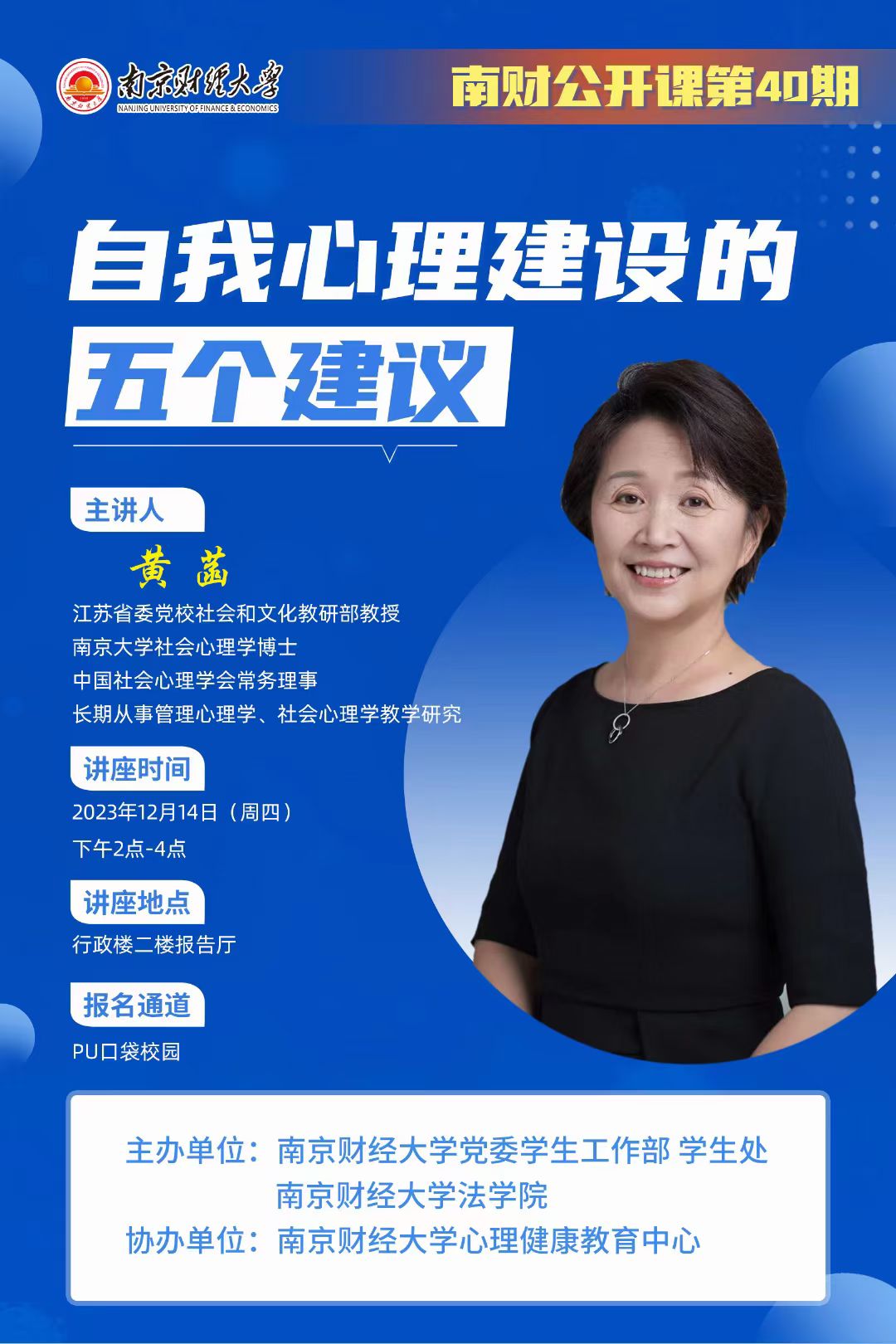 为了进一步关注大学生心理健康状况,满足学生更高层次的精神需求,2023年12月14日下午,校党委学生工作部、学生处、黑料网 协同校心理健康教育中心联合举办了第40期南财“公开课”,邀请江苏省委党校社会和文化教研部教授、南京大学社会心理学博士、中国社会心理学会常务理事黄菡教授莅临现场,为全体师生带来“关于自我心理建设的五个建议”专题讲座。校党委学生工作部部长、学生处处长韩力争,校党委学生工作部副部长、学生处副处长袁怡琨,校心理健康教育中心主任赵亮、副主任吴垠以及各学院师生参加讲座。讲座由黑料网 社工系系主任许芸副教授主持。